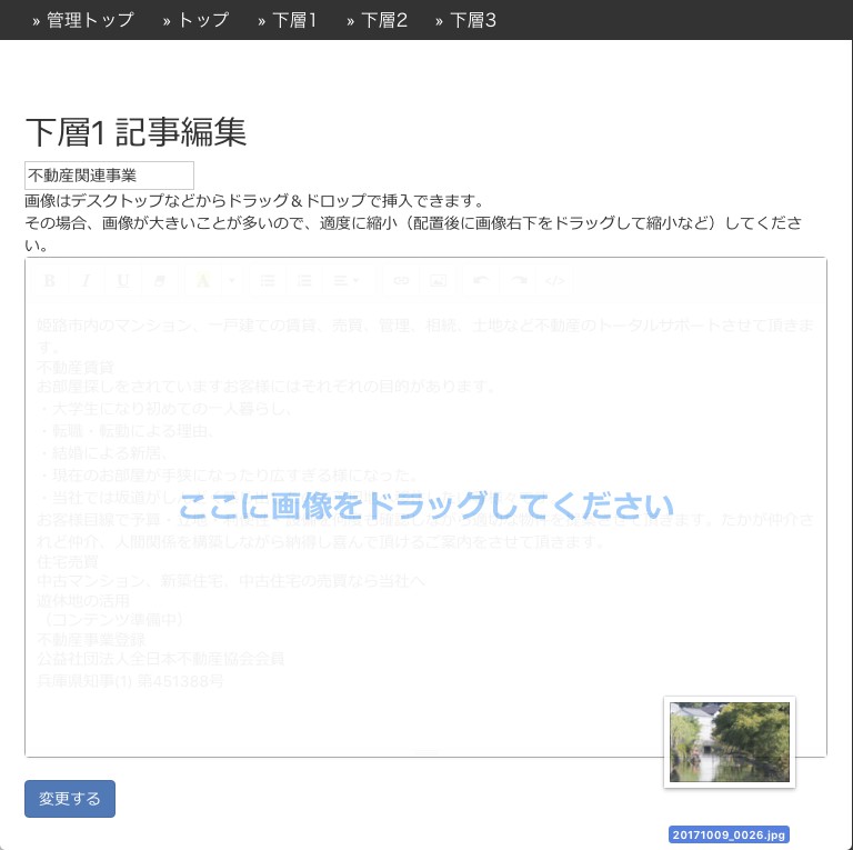WordPressよりかんたんな管理画面となっており、必要最低限の機能でシンプルに仕上げております。特に画像の挿入に関しては、デスクトップにある画像をドラッグ&ドロップするだけで自動的に最適なサイズに調整されますので、パソコンの操作が苦手な方でも簡単に更新ができます。